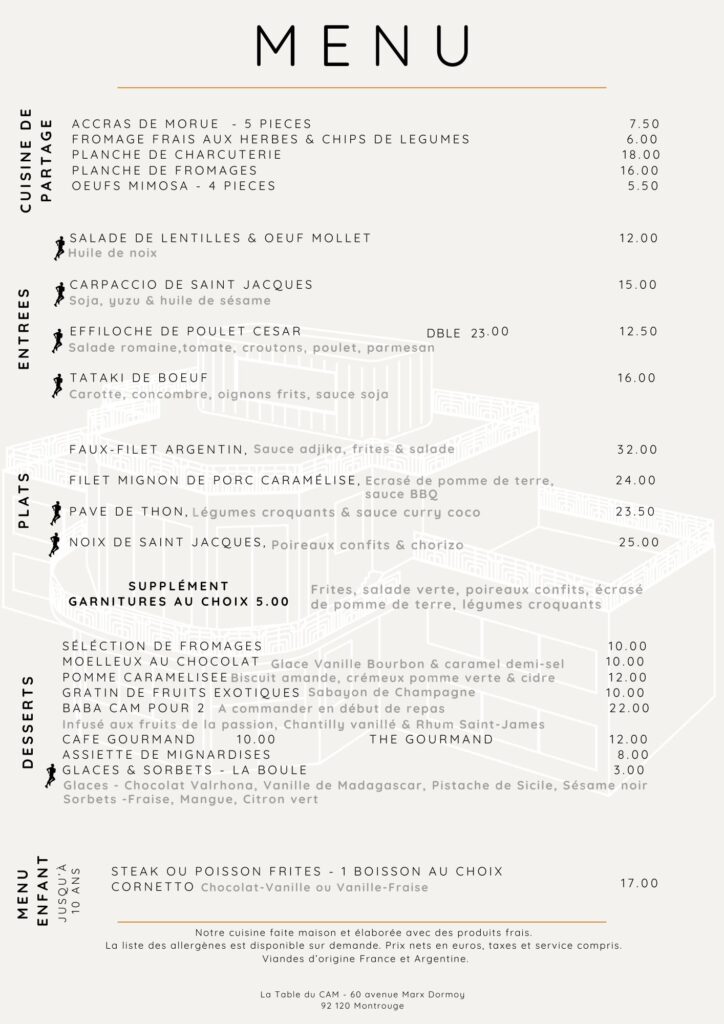 Entrez dans l’ambiance élégante et intemporelle du tennis club des années 30, où le Cercle Athlétique de Montrouge – CAM est réputé depuis des décennies. Savourez sur le court central une cuisine raffinée et authentique élaborée avec des produits frais par des chefs talentueux.